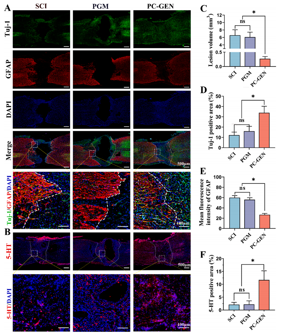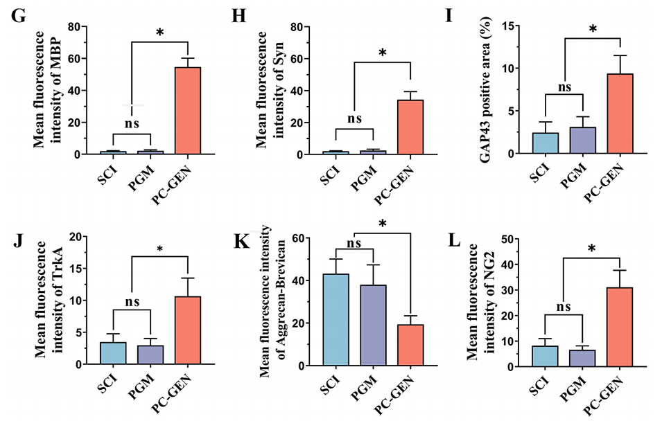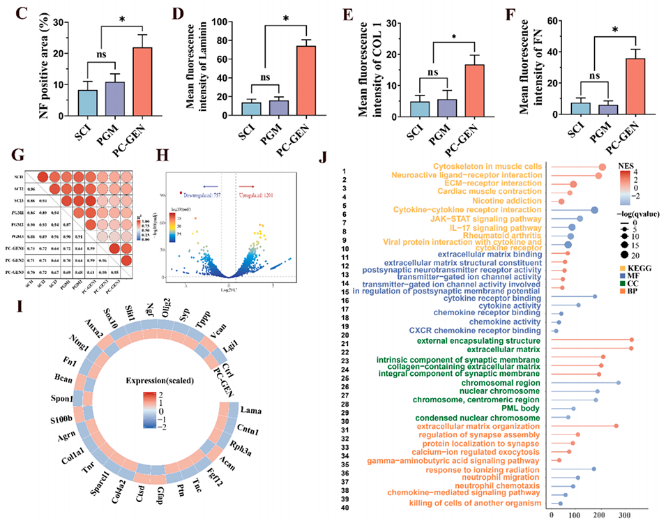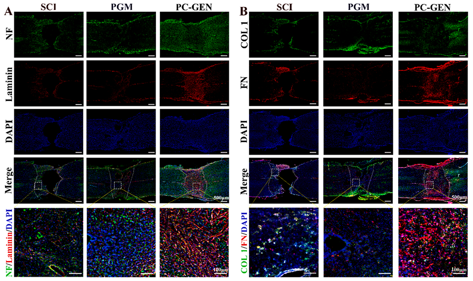 图6:PC-GEN增强了细胞外基质的沉积,并促进了受损区域神经丝的迁移。