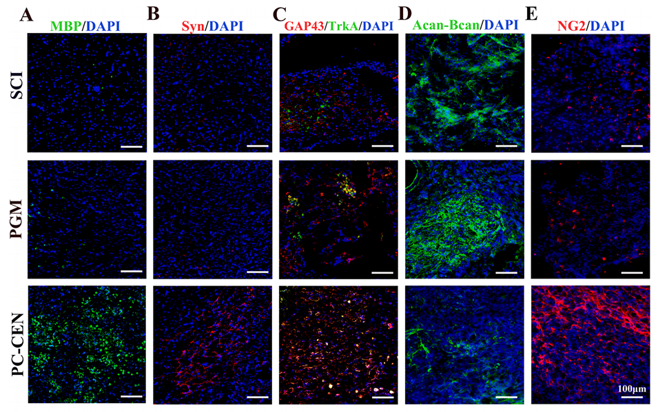 图7:PC-GEN为新生轴突创造了适宜的微环境,并构建了功能性神经网络。