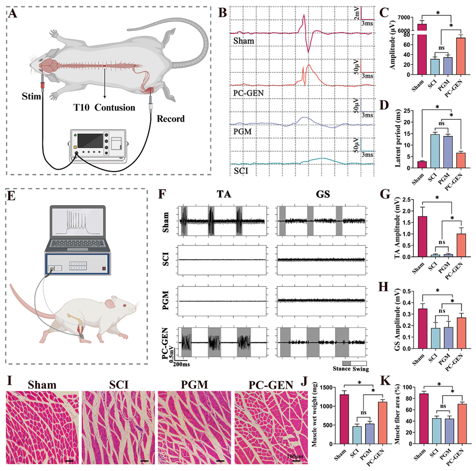 图9:PC-GEN促进了脊髓损伤大鼠的电生理恢复,并减轻了骨骼肌萎缩。