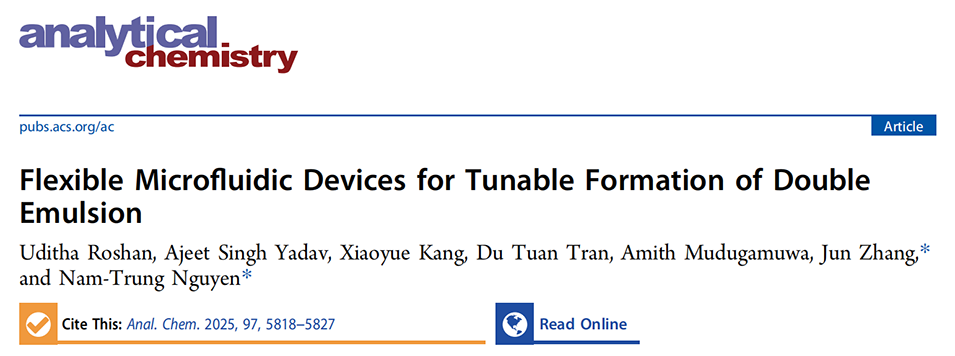近期,澳大利亚格里菲斯大学Nguyen Nam-Trung教授、张俊博士等人开发了一种柔性可拉伸的微流控装置,通过调节通道尺寸实现了对双乳液核心尺寸、壳层厚度和生成频率的精确控制,无需改变流体流速或重新设计装置。这一创新技术突破了传统方法的局限,为双乳液的高精度、可重复生成提供了灵活的调控手段,显著提升了微流控技术在生物医学、食品科学等领域的应用潜力。相关研究以“Flexible Microfluidic Devices for Tunable Formation of Double Emulsion”为题目,发表在期刊《Analytical Chemistry》上。