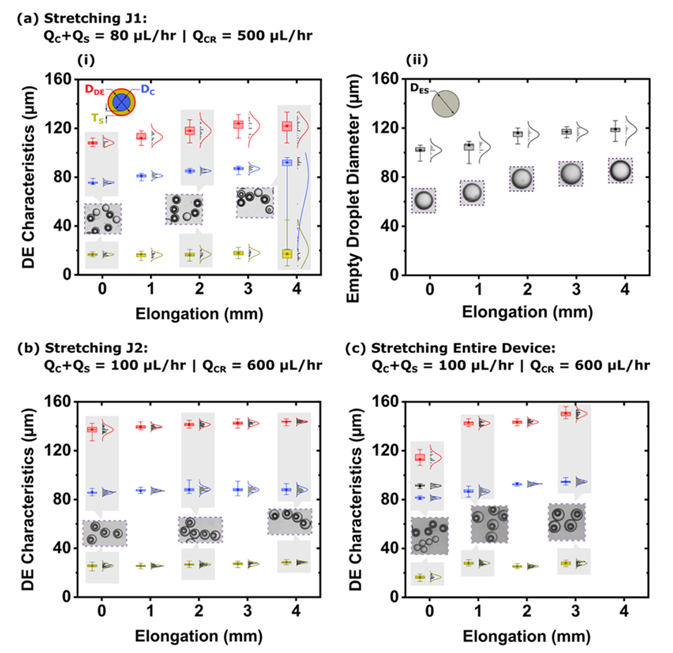 图5.(a)拉伸连接1时,核心直径(DC)、双乳液外径(DDE)和壳层厚度(TS)以及空壳液滴直径(DES)的变化(分别对应蓝色、红色、黄色和灰色曲线)。(b)拉伸连接2时,核心直径(DC)、双乳液外径(DDE)和壳层厚度(TS)的变化(分别对应蓝色、红色和黄色曲线)。(c)拉伸整个装置时,核心直径(DC)、双乳液外径(DDE)、壳层厚度(TS)和空壳液滴直径(DES)的变化(分别对应蓝色、红色、黄色和灰色曲线)。