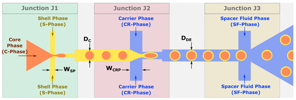 3、该装置采用两步流动聚焦结构,分别拉伸第一、第二节点可独立调控核心尺寸与壳层厚度,拉伸整体设备则可同步调节。数值模拟与实验结果验证了通道尺寸变化对乳液特性的影响。