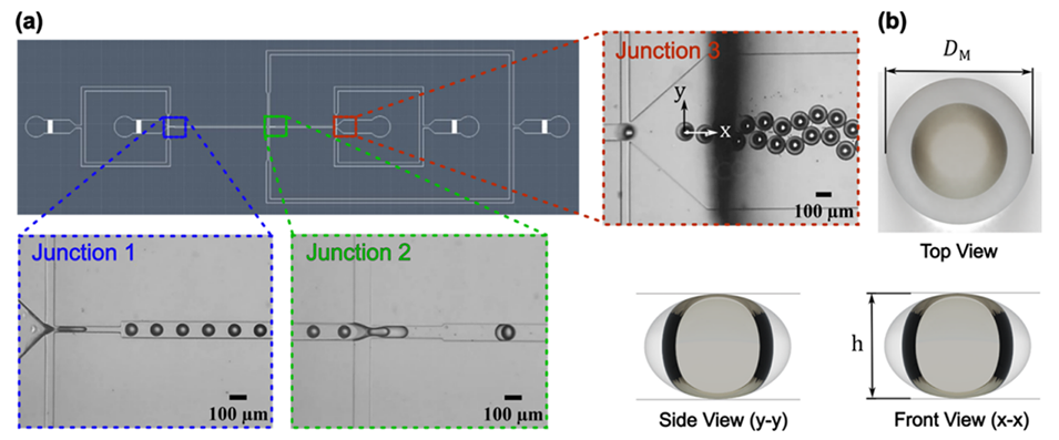 图3.(a)在两步流动聚焦微流体装置中形成双乳液液滴。核心液滴在连接1处通过壳层流体的剪切作用形成,随后在连接2处被载体流体包裹形成双乳液滴。最后,间隔流体将形成的双乳液液滴导向出口。(b)双乳液液滴在通道壁的约束下(h<DM)获得椭球形状的示意图。