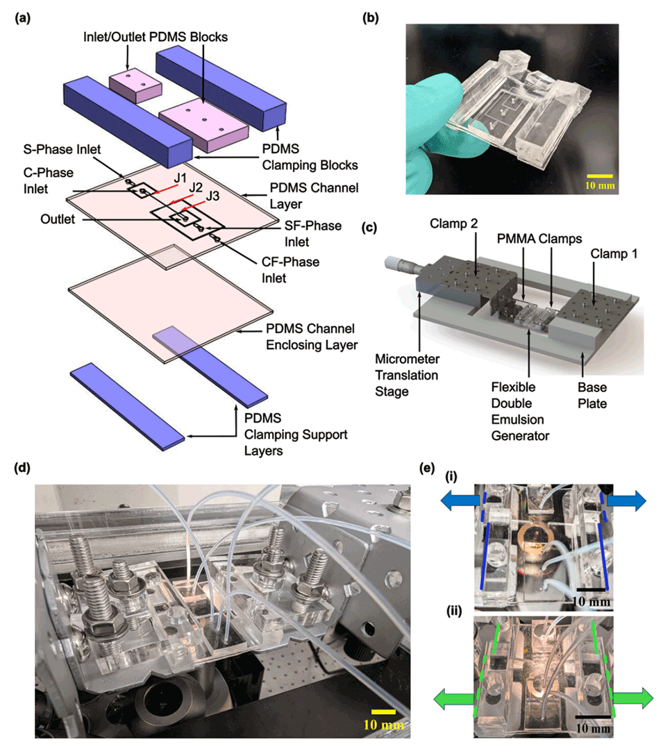 图2.(a)可拉伸双乳液发生器的示意图。(b)柔性PDMS微流体装置的照片。(c)柔性微流体双乳液发生器和拉伸平台的示意图。(d)实验装置的照片。(e)不同拉伸模式下的柔性双乳液发生器:(i)连接1的拉伸;(ii)连接2的拉伸。