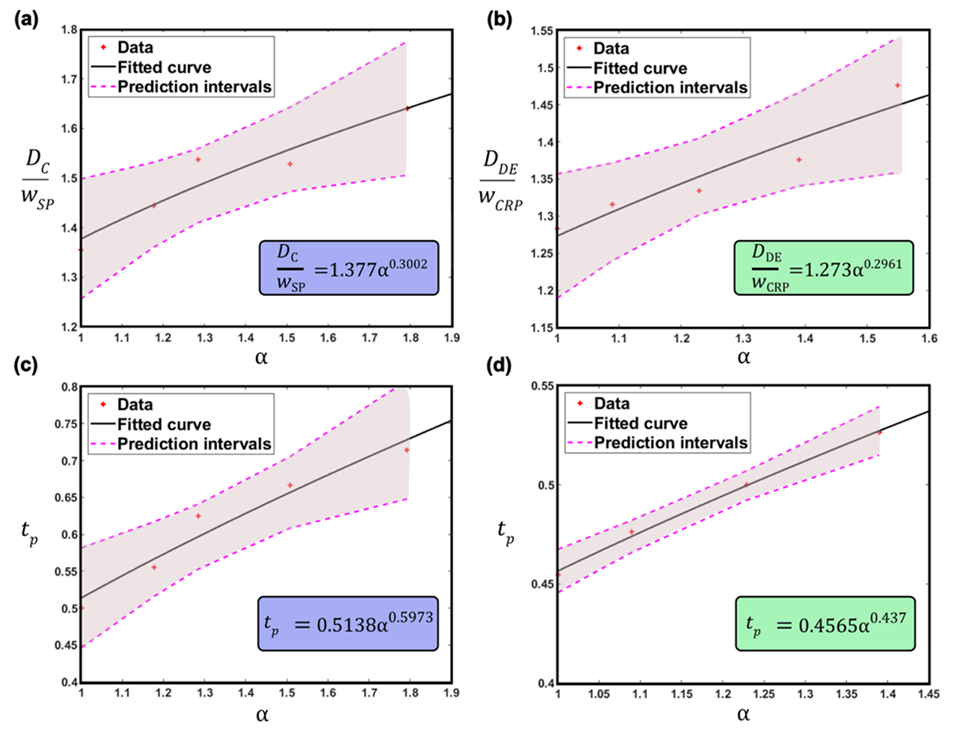 图6.在QC=20μL/h、QS=60μL/h和QCRP=500μL/h的条件下,(a)拉伸整个装置时,核心尺寸与拉伸变量的归一化关系。(b)拉伸整个装置时,双乳液外径与拉伸变量的归一化关系。(c)核心液滴的剪切时间与拉伸变量的关系。(d)双乳液液滴的剪切时间与拉伸变量的关系。