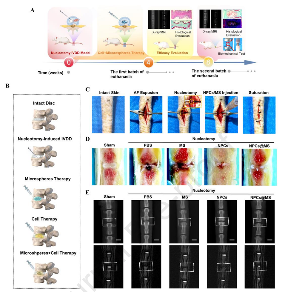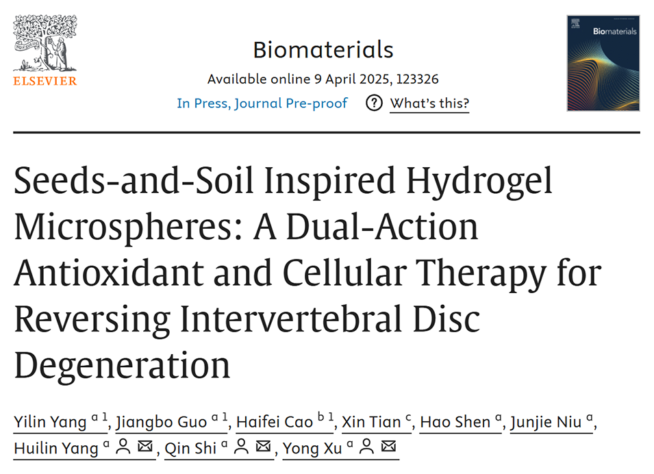 椎间盘退变(IVDD)是全球高发疾病,其治疗面临组织与功能双重修复的挑战。近期,苏州大学骨科研究所杨惠林教授、施勤教授、徐勇教授等人开发了一种基于“种子与土壤”策略的双功能抗氧化水凝胶微球,通过外源性补充髓核细胞和仿生细胞外基质,结合多酚抗氧化成分,成功逆转椎间盘退变的病理进程。相关研究以“Seeds-and-Soil Inspired Hydrogel Microspheres: A Dual-Action Antioxidant and Cellular Therapy for Reversing Intervertebral Disc Degeneration”为题目,发表在期刊《Biomaterials》上。