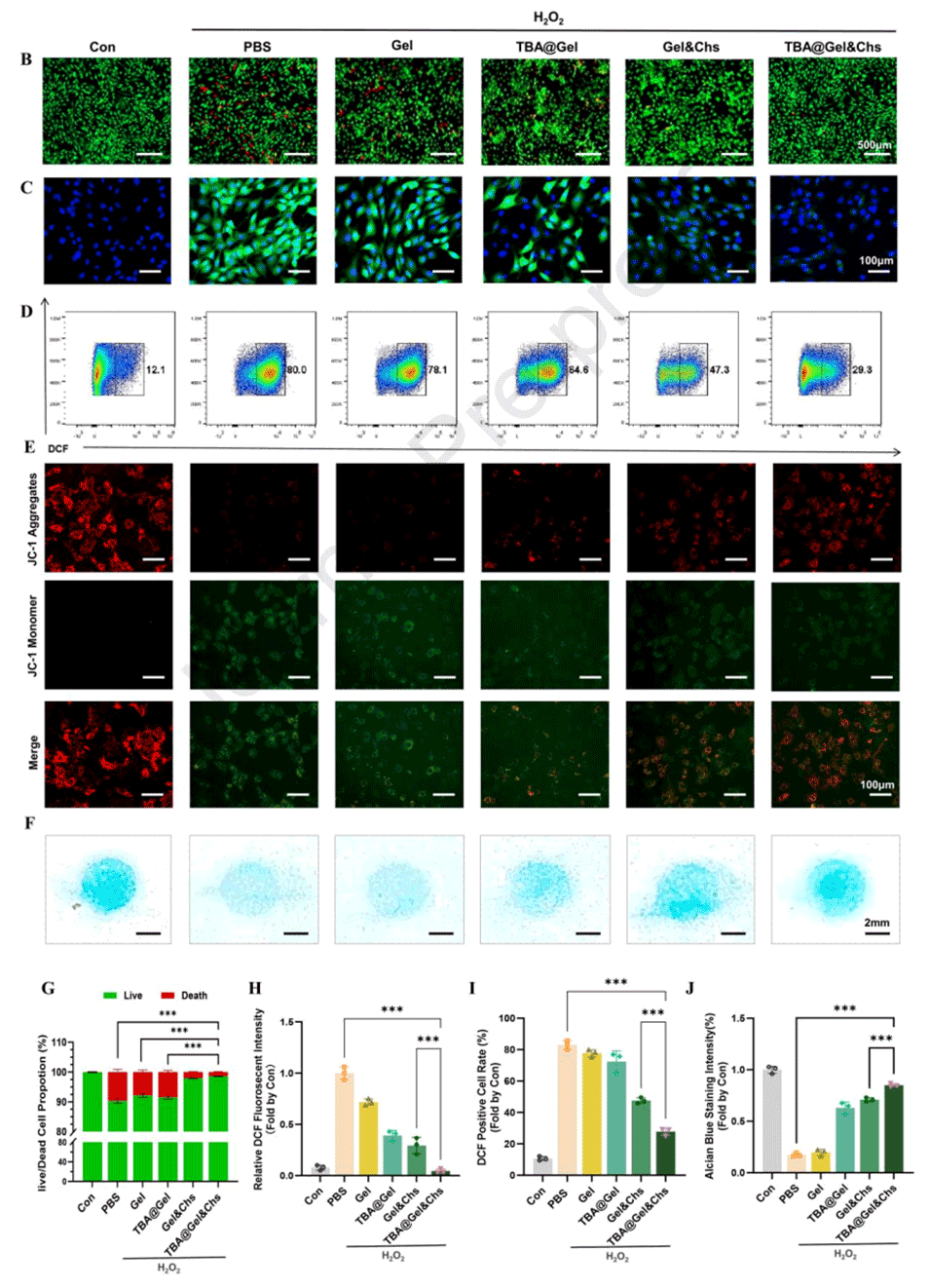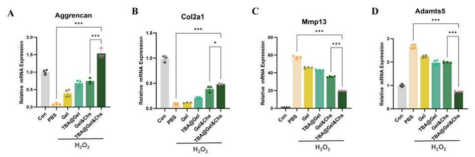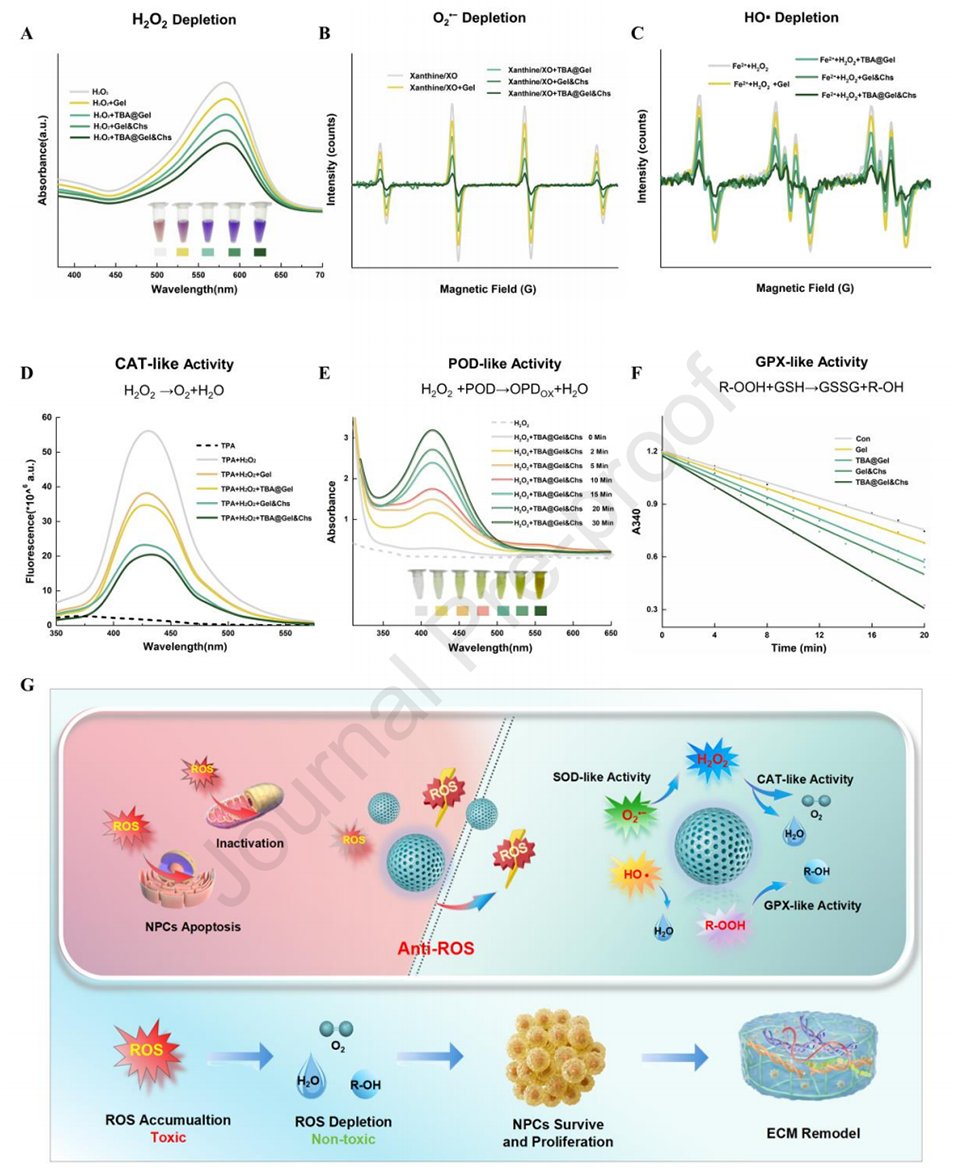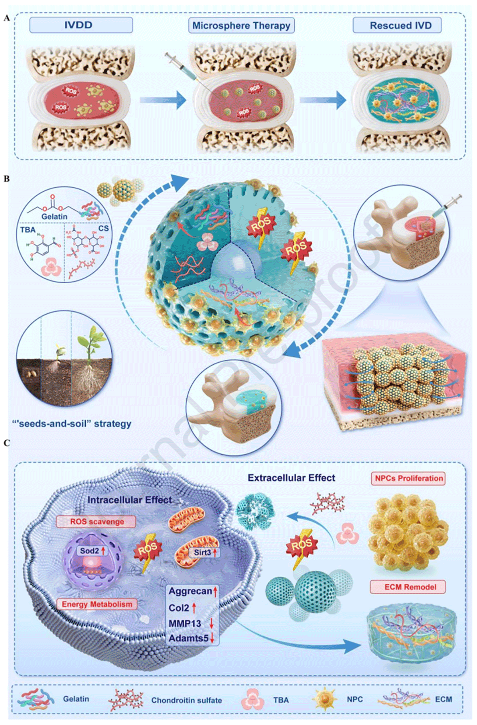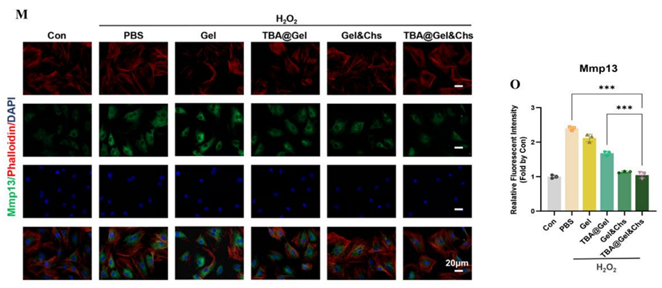 2、该微球系统通过补充外源性NPCs(“种子”)和ECM类似物(“土壤”),并引入合成多酚抗氧化成分TBA,从细胞内外双重作用以清除活性氧(ROS),阻断氧化应激-IVDD的恶性循环。
