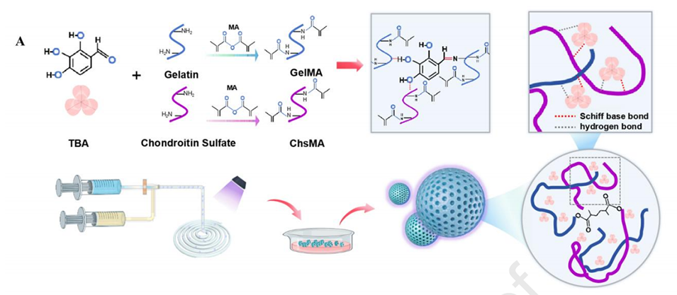 液滴经365 nm紫外光照射,引发GelMA和ChsMA的甲基丙烯酸基团共价交联,同时TBA的醛基与明胶氨基形成动态席夫碱键,进一步增强微球机械性能和组织黏附性。