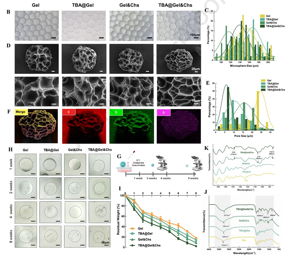 冻干后微球孔径为5-25 μm,表面均匀分布Gel、Chs和TBA成分,通过SEM和FTIR验证形貌及化学键合。