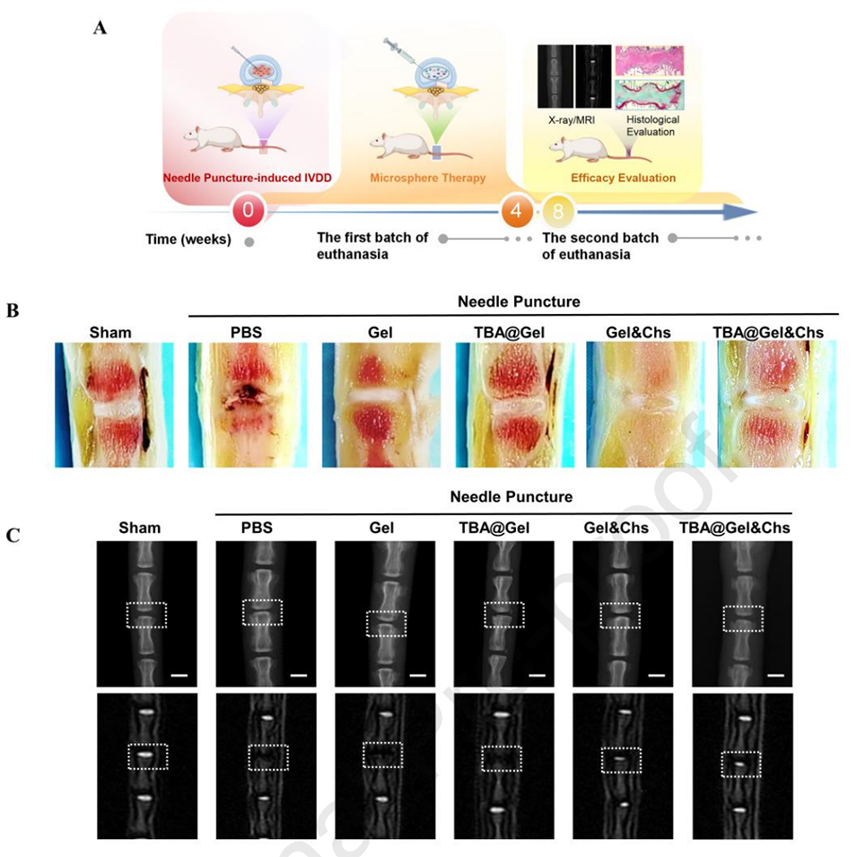 1、本研究受“种子与土壤”策略启发,开发了一种负载髓核细胞(NPCs)的TBA@Gel&Chs水凝胶微球,用于逆转IVDD。