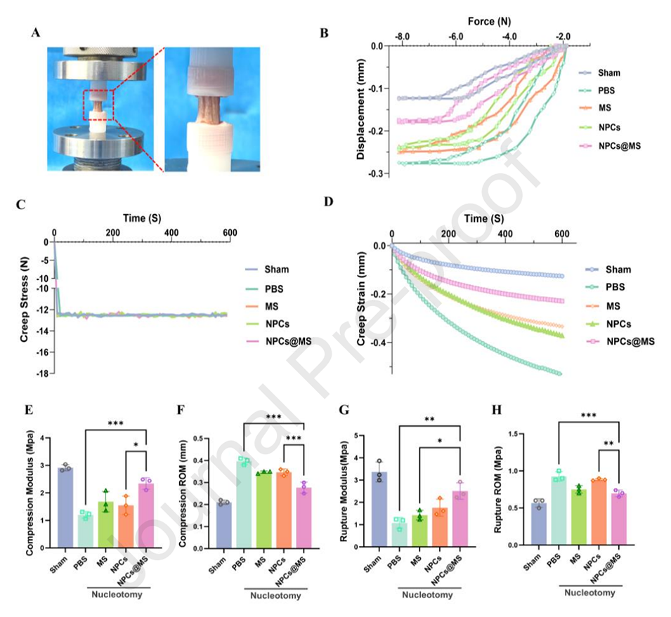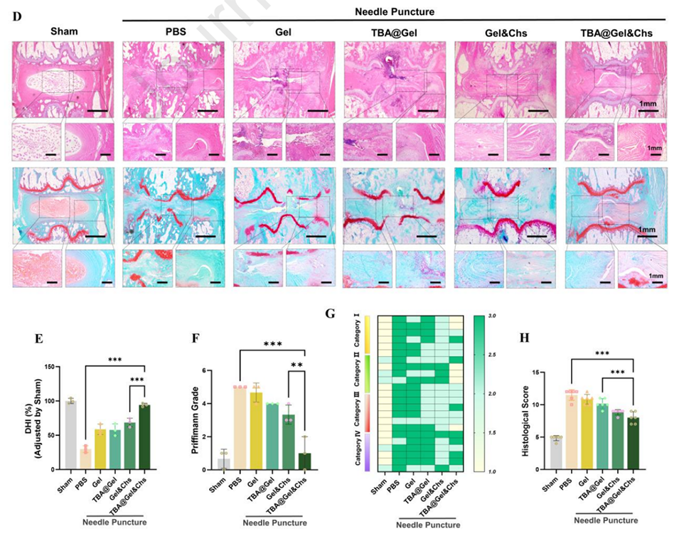 4、大鼠模型显示,微球治疗显著恢复了退变椎间盘的组织结构、ECM稳态及力学性能。