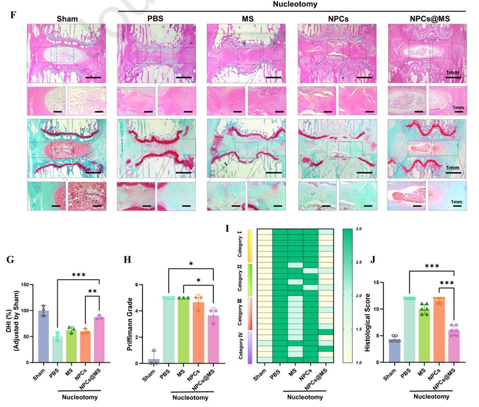 图8.水凝胶微球在髓核摘除术诱导的大鼠椎间盘退变(IVDD)模型中促进髓核(NP)修复的体内疗效(治疗8周后)。
