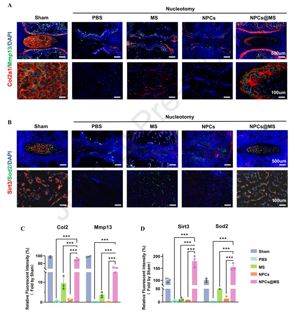 3、实验表明,微球不仅能高效清除H2O2、O2-、·OH等ROS,还能上调NPCs内抗氧化蛋白Sirt3和Sod2的表达,保护细胞活力及生理功能。
