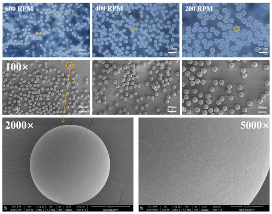 图2.通过离心微流控技术制备的利培酮载药PLGA微球(RIS-MS)的显微镜和扫描电子显微镜(SEM)图像。