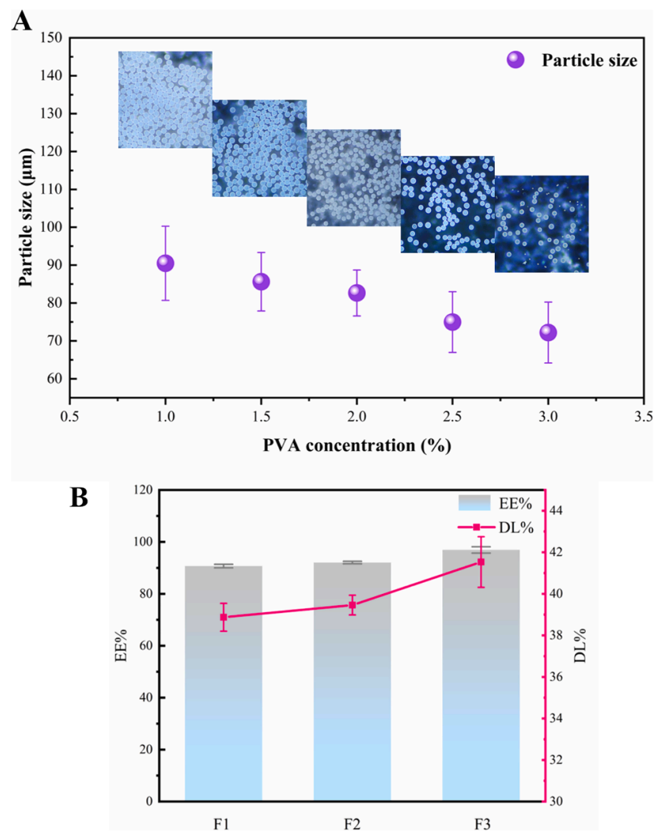 图4.(A)不同PVA浓度制备的RIS-MS(n=3);(B)不同PLGA类型制备的RIS-MS的包封率(EE%)和载药量(DL%,n=3)。