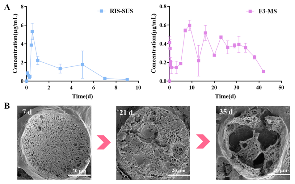 图7.RIS-MS组和混悬液组的利培酮平均血浆浓度(A)以及RIS-MS的体内降解(B)。
