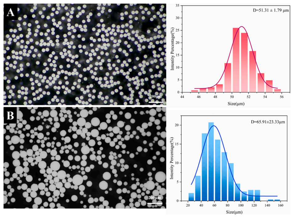 图5.不同方法制备的RIS-MS的粒径分布,(A)离心微流控法,(B)乳化溶剂挥发法。