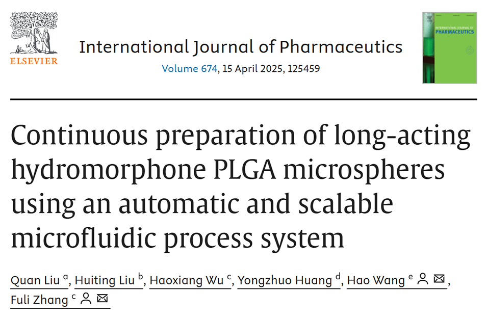 近期,上海医药工业研究院张福利教授、药物制剂国家工程研究中心王浩研究员等人在长效缓释药物制剂领域取得重要进展,成功开发了一种用于慢性疼痛管理的长效羟吗啡酮(HM)载药聚乳酸-羟基乙酸共聚物(PLGA)微球,并采用自动化、可扩展的微流体工艺系统实现了其连续化制备。该研究通过优化微流体工艺参数,制备出粒径可控、载药量高、包封率高的HM-PLGA微球,并在动物实验中验证了其长效缓释特性,为长效注射剂的连续化生产提供了新的技术平台。相关研究以“Continuous preparation of long-acting hydromorphone PLGA microspheres using an automatic and scalable microfluidic process system”为题目,发表于期刊《International Journal of Pharmaceutics》。