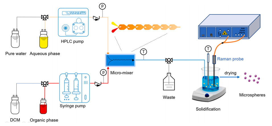 2、该系统由一个用于颗粒生成的新型微混合器、用于连续加药的注射器和HPLC泵、一个作为过程分析技术(PAT)工具的过程拉曼光谱仪和一个用于可编程自动控制的自动化系统组成。