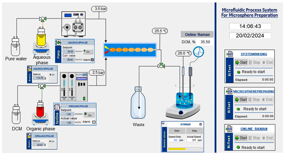 图2.LabVision软件中微流体工艺系统制备微球的过程可视化和自动化。