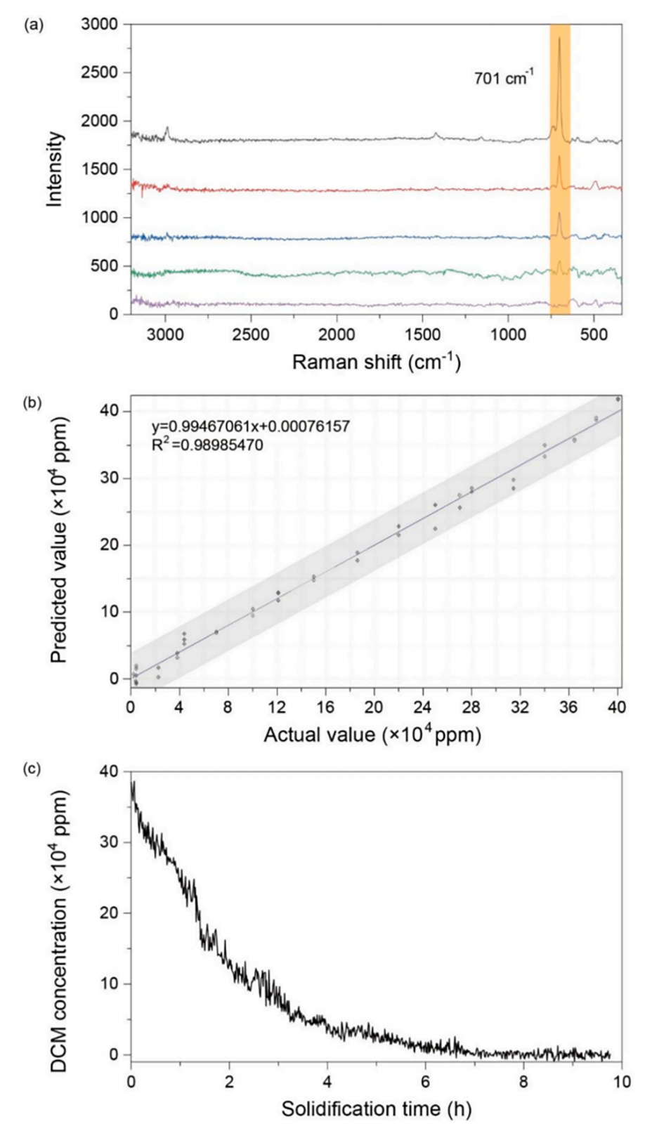 图3.(a)固化过程中采集的在线拉曼光谱;(b)使用PLS算法对DCM进行拉曼分析时,实际浓度与模型预测浓度的定量关系;(c)在整个固化过程中基于拉曼分析监测DCM浓度。