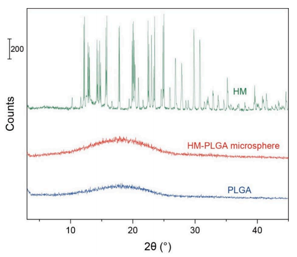 图7.HM-PLGA微球(红色)、PLGA(蓝色)和HM(绿色)的X射线衍射(XRD)图谱。