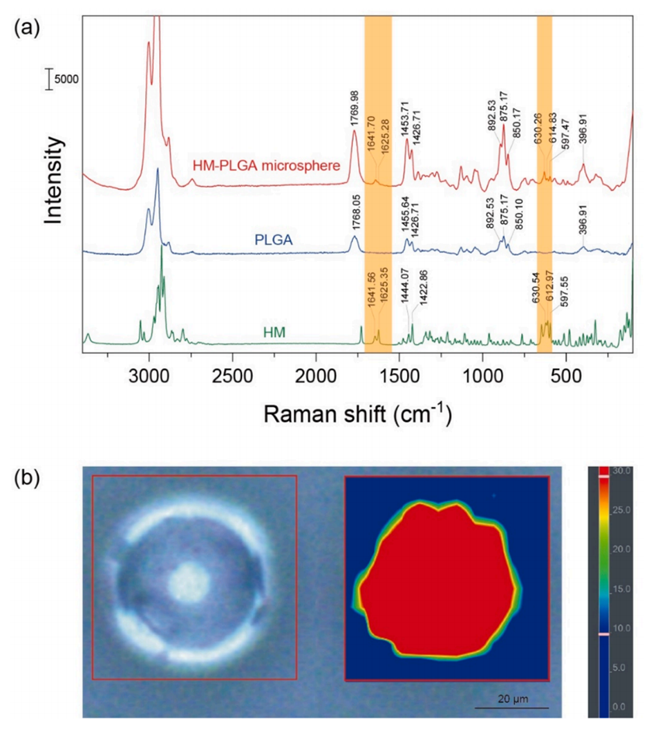 图6.(a)HM-PLGA微球、PLGA和HM的拉曼位移。(b)HM-PLGA微球的拉曼显微镜药物分布图像。
