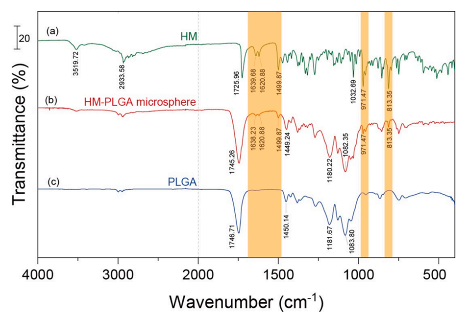 图5.HM(a)、PLGA(b)和HM-PLGA微球(c)的傅里叶变换红外光谱(FT-IR)。