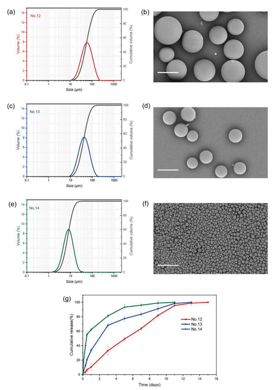 图4.使用微流体工艺系统获得的HM载药微球的粒径分布和形貌:粒径分布:(a)No.12,(c)No.13,(e)No.14;扫描电子显微镜(SEM)图像:(b)No.12,(d)No.13,(f)No.14,比例尺为50μm;(g)No.12、No.13和No.14 HM-PLGA微球的体外药物释放。