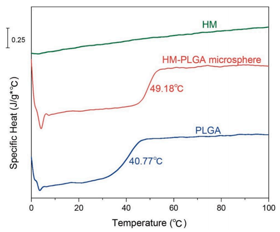 图8.HM-PLGA微球(红色)、PLGA(蓝色)和HM(绿色)的差示扫描量热法(DSC)曲线。