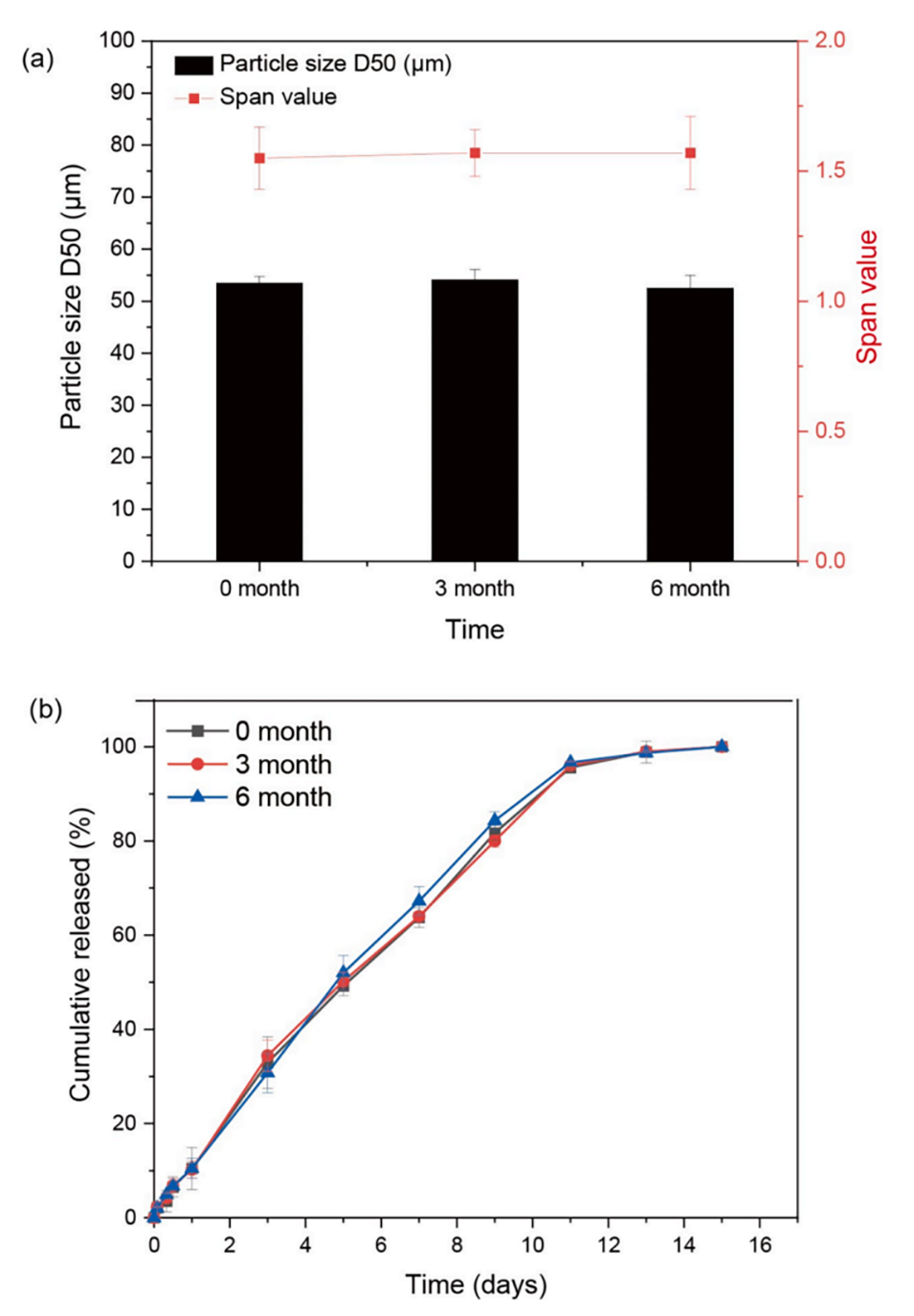 图9.新鲜制备的HM-PLGA微球以及在2–8℃下避光保存3个月和6个月的微球的粒径(a)和体外药物释放曲线(b)。