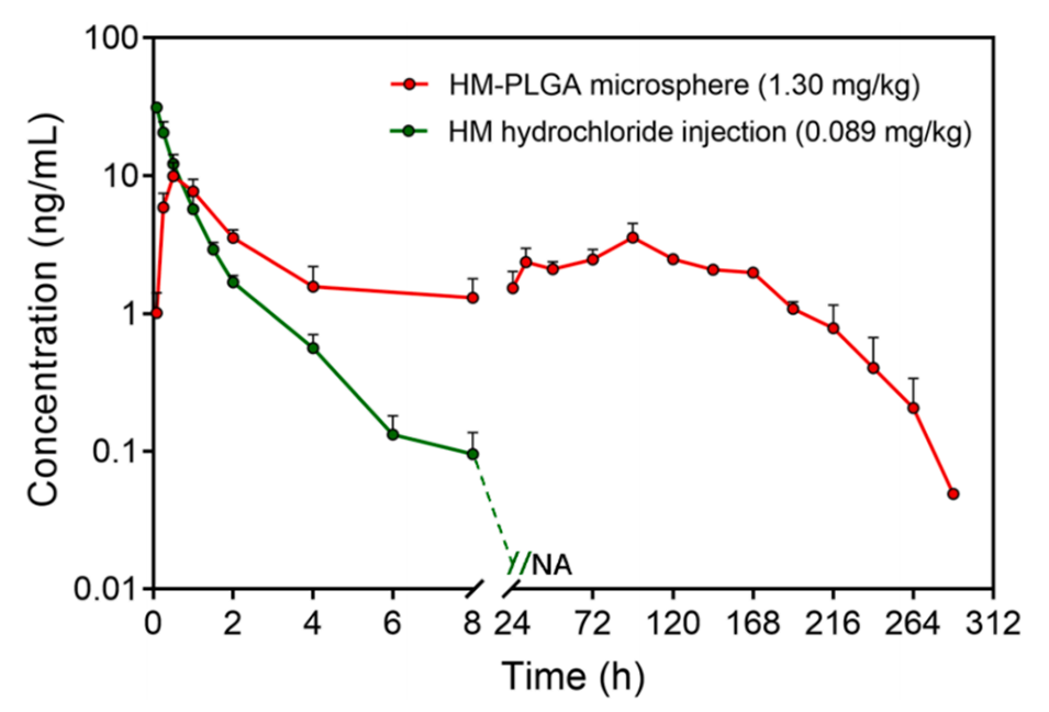 5、雌性ICR小鼠的药代动力学实验证实,与盐酸HM注射液相比,其在血浆中的暴露时间延长。比格犬体内研究表明,HM-PLGA微球可提供超过11天的持续药物释放。