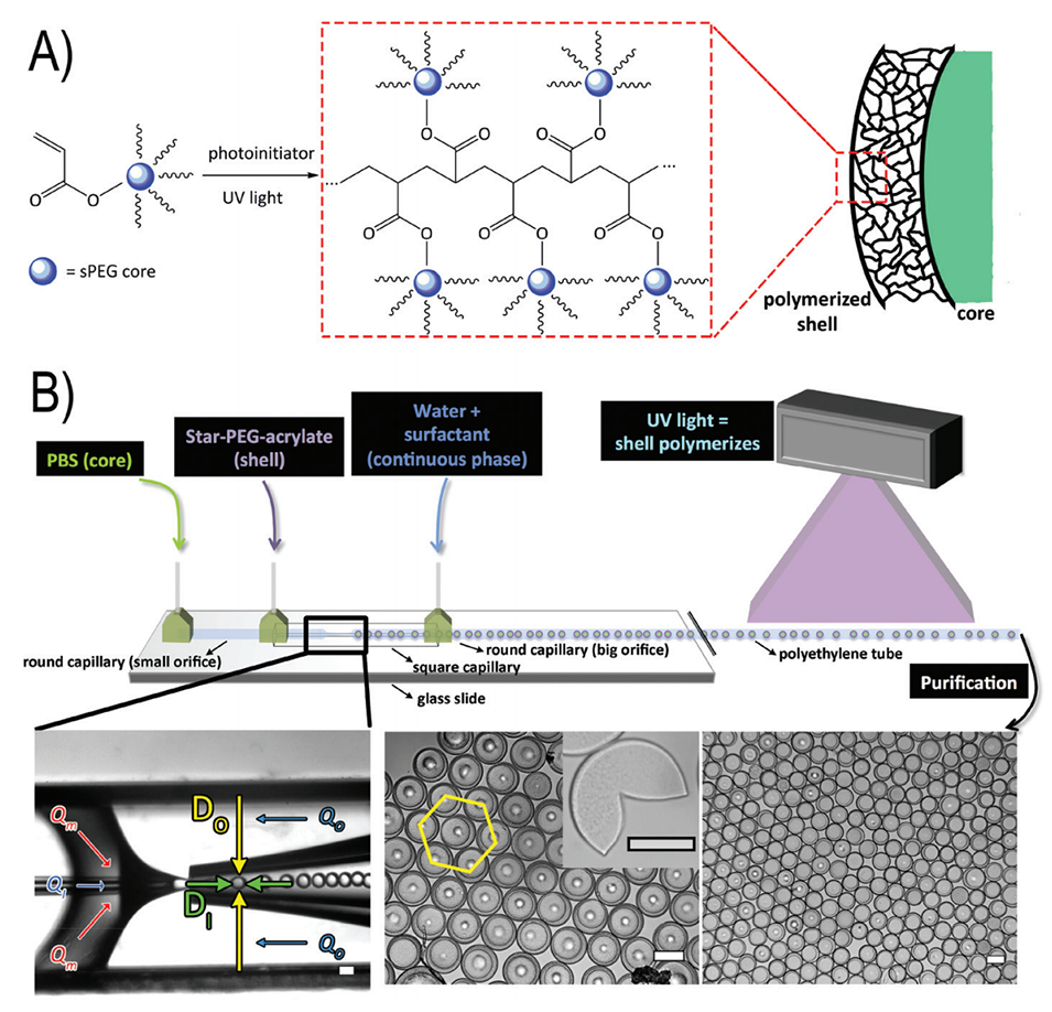 图1.A:sPEG-A的化学交联过程示意图。B:实验装置示意图:两根圆形毛细管放置在一个方形毛细管内。注入相应的液体,在毛细管对齐处形成双乳液。双乳液形成后,用紫外光照射双乳液液滴,持续5-15秒,以聚合sPEG-A并产生微凝胶胶囊。微凝胶胶囊中心出现的白点是由于与底部玻璃片接触所致。比例尺为100 µm。