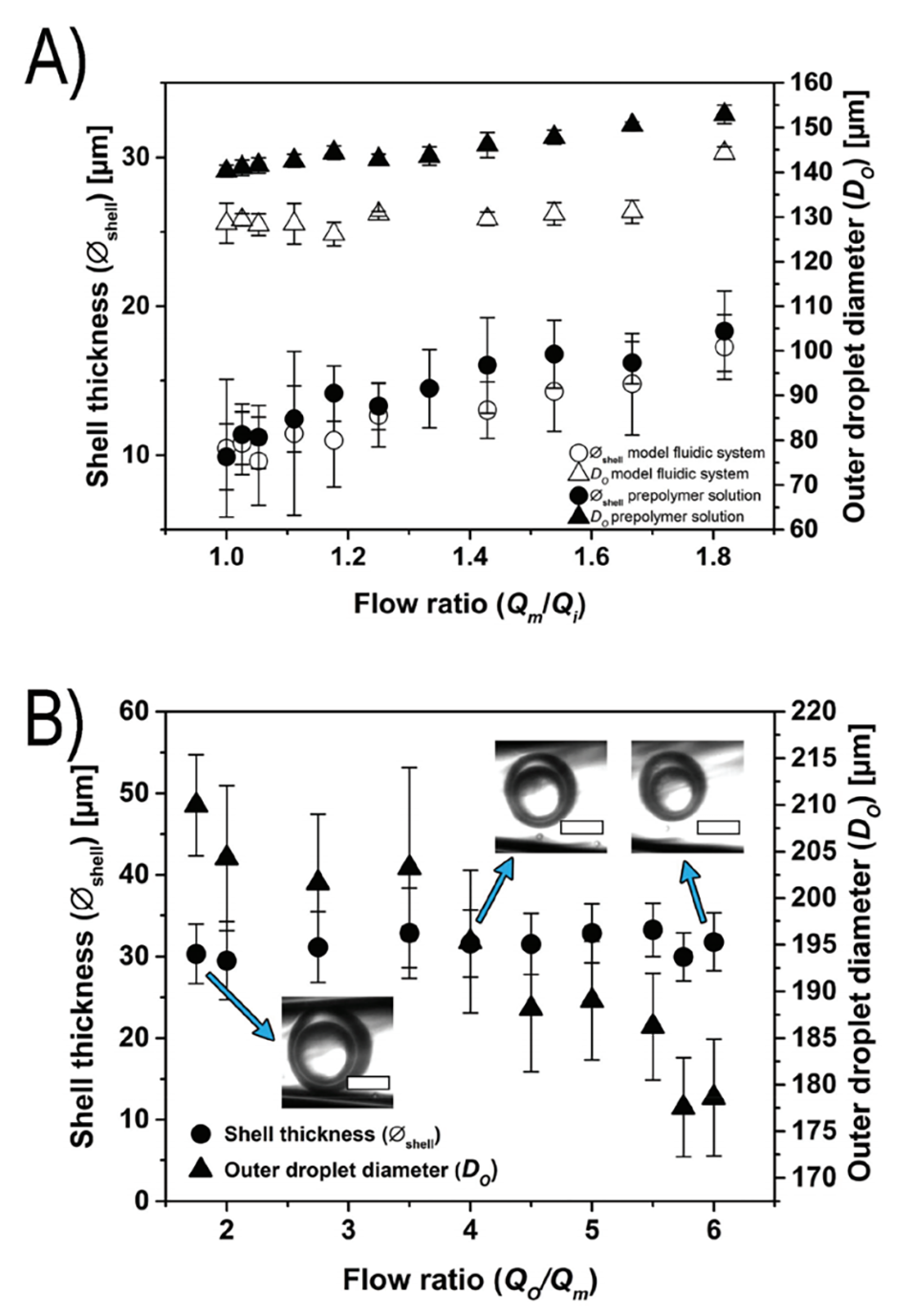 图2.A:通过改变内相流速(Qi)来调节壳厚度:在保持外相(Qo)和中相(Qm)流速分别为10 mL/h和2 mL/h的情况下,改变内相流速可以精确控制壳厚度,同时保持外径相对恒定。B:通过改变外相流速(Qo)来调节滴液尺寸:在保持中间相(Qm)和内相(Qi)流速分别为4 mL/h和1.5 mL/h的情况下,改变外相流速可以精确控制滴液的外径,同时保持壳厚度恒定。比例尺为100 µm。