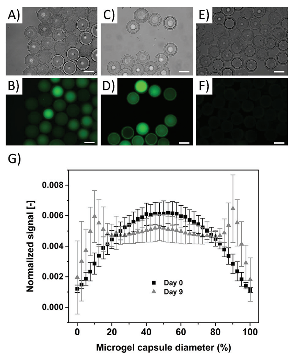 图5.A-B:纯化后(0天)含10 kDa FITC-葡聚糖的微凝胶胶囊明场及荧光图像,荧光信号集中于内腔。C-D:9天后荧光信号向壳层扩散,表明分子随壳层水解缓慢释放。E-F:无FITC-葡聚糖的对照胶囊无荧光信号。G:荧光信号分布分析显示,0天时信号呈钟形(集中于内腔),9天时信号在壳层处形成双峰,证实分子通过多孔网络扩散。