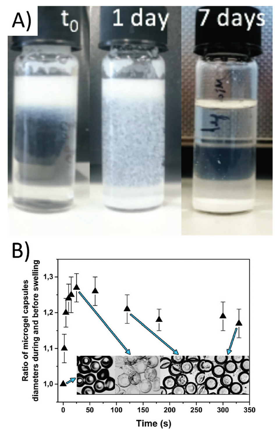 图3.A:sPEG微凝胶胶囊的溶胀行为:微凝胶胶囊中的甲苯被水置换的过程。甲苯蒸发后,微凝胶胶囊在9天内逐渐沉降。B:微凝胶胶囊在水中的溶胀实验。记录了微凝胶胶囊直径随时间的变化。干燥的扁平颗粒迅速溶胀。