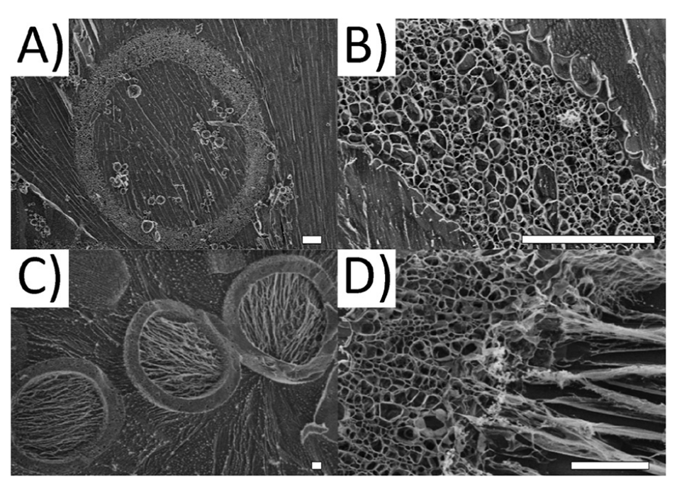 图4.冷冻扫描电子显微镜(cryo-SEM)图像显示微凝胶胶囊的结构:样品经过纯化并储存在Milli-Q水中。A:在-80°C下,10分钟升华时间,700×放大。B:在-80°C下,10分钟升华时间,5000×放大。C:在-80°C下,25分钟升华时间,400×放大。D:在-80°C下,25分钟升华时间,3000×放大。比例尺为10 µm。