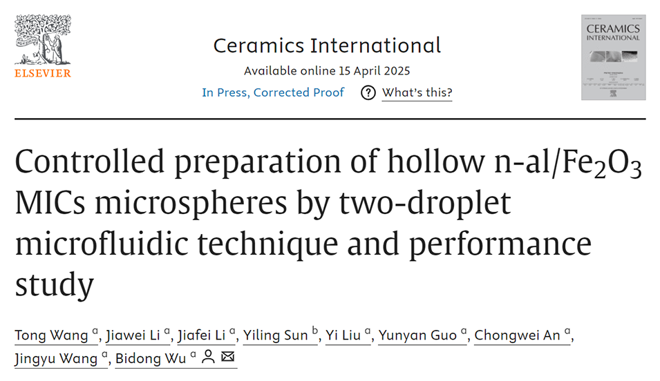空心微球含能材料由于其独特的结构和性能,在多个领域展现出广泛的应用潜力。近期,中北大学环境与安全工程学院武碧栋副教授团队通过双液滴微流控技术,基于溶剂扩散原理成功制备了空心结构的n-Al/Fe2O3亚稳态分子间复合物(MICs)微球。系统揭示了有机溶剂流速与悬浮液浓度对微球壳层厚度及表面形貌的调控机制。研究发现,空心结构通过促进热对流传递使热分解温度较实心微球提前5.7–12°C,薄壳微球(壳厚约5μm)在燃烧过程中展现出更高反应效率与更少残留物,为高能含能材料的微观结构设计与性能优化提供了创新方法。相关研究以“Controlled preparation of hollow n-al/Fe2O3 MICs microspheres by two-droplet microfluidic technique and performance study”为题目,发表在期刊《Ceramics International》上。