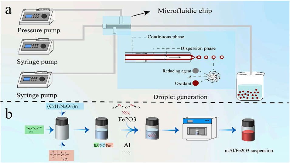 同轴注入:分散相1(含燃料与氧化剂)与分散相2(有机溶剂)通过三层毛细管同轴注入连续相中。因连续相流速更高,剪切力将分散相切割为双层微滴(核心为分散相2,外层为分散相1)。