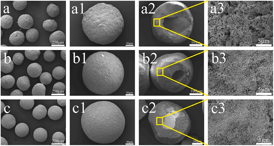 图3.不同悬浮液浓度下制备的n-Al/Fe2O3 MICs微球以及实心微球的SEM图:(a)浓度为0.2g/ml;(b)浓度为0.3g/ml;(c)浓度为0.4g/ml。