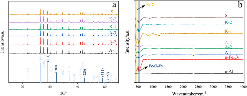 结构验证:通过SEM、XRD和FT-IR确认空心结构完整,微球中仅存在n-Al粉末和n-Fe2O3粉末晶体,Fe2O3的α相晶体结构在制备过程中没有发生变化。