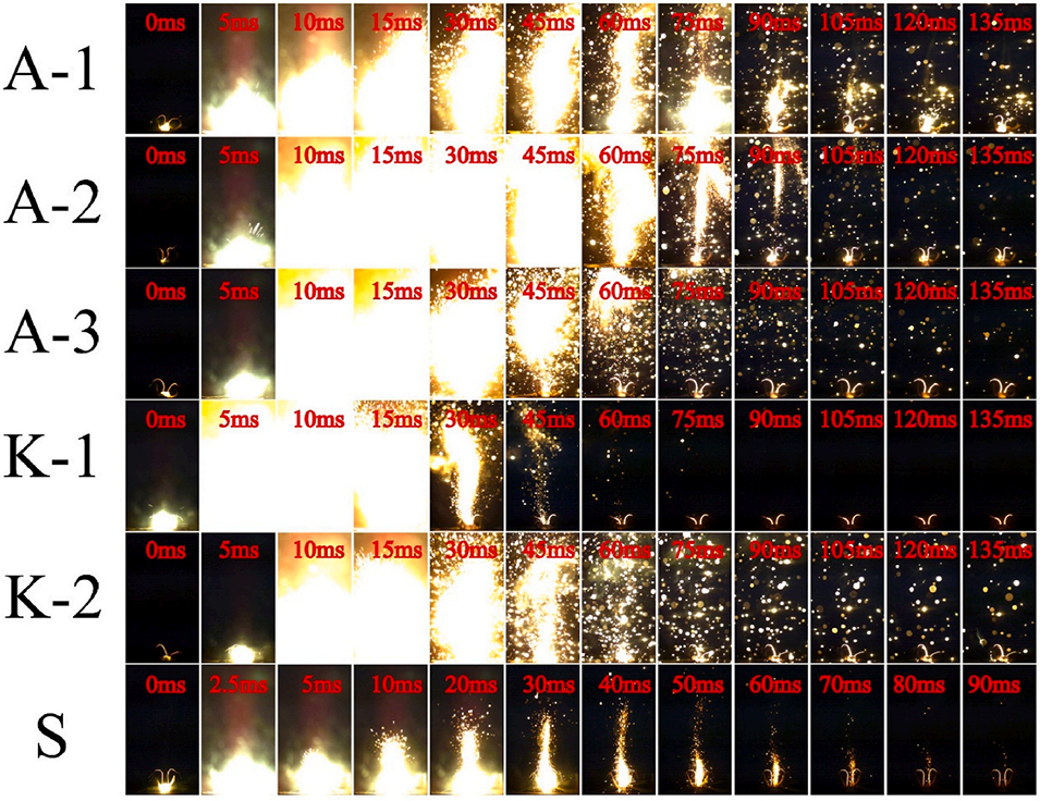 在燃烧性能方面,空心微球因薄壳结构和更大的比表面积,显著增加了燃料与氧化剂的接触面积,同时空腔形成的氧气通道优化了燃烧环境,使得燃烧残留几乎为零,火焰更剧烈且燃烧时间集中(如薄壳微球A-3的火焰集中在5–60 ms),能量释放更为充分。