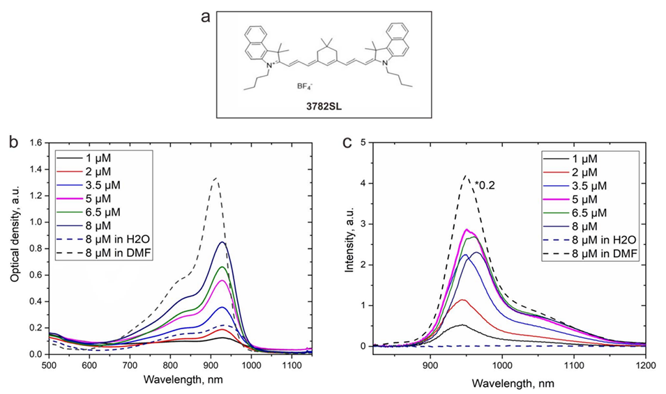 图2.(a):近红外荧光染料3782SL的化学结构。(b):3782SL染料在水、DMF以及纳米颗粒水分散液(NP01D纳米制剂)中的吸收光谱。(c):3782SL染料在水、DMF以及纳米颗粒水分散液(NP01D纳米制剂)中的荧光光谱。