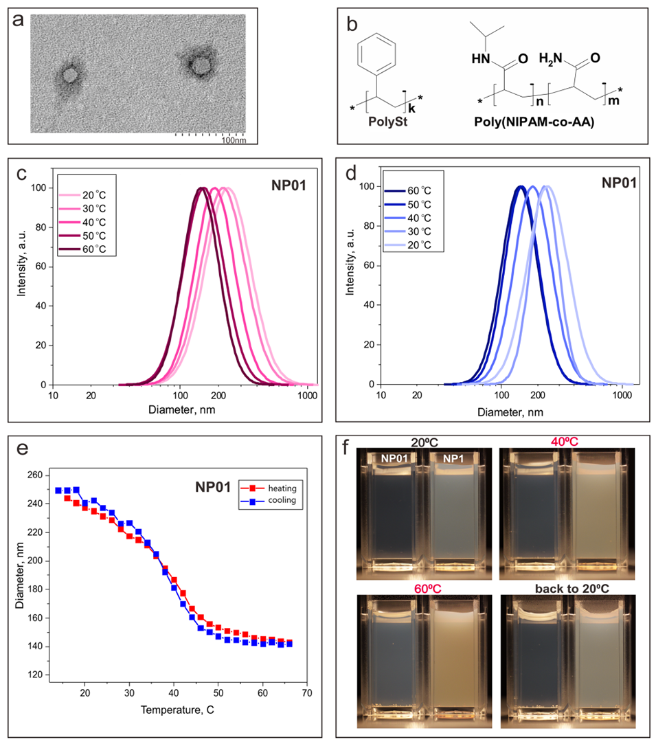 图1.(a):聚苯乙烯-聚(N-异丙基丙烯酰胺-co-丙烯酰胺)核壳纳米颗粒的透射电子显微镜(TEM)图像。(b):组成纳米颗粒的聚合物的化学结构。(c):动态光散射(DLS)结果显示纳米颗粒尺寸分布随纳米颗粒水分散液加热(0.1% w/v)的变化。(d):DLS结果显示纳米颗粒尺寸分布随纳米颗粒水分散液冷却(0.1% w/v)的变化。(e):DLS结果显示纳米颗粒尺寸随纳米颗粒水分散液(0.1% w/v)加热和冷却的变化。(f):纳米颗粒水分散液(浓度分别为0.1% w/v和1% w/v)在20°C下加热至40°C和60°C后,再冷却回20°C的光学照片。
