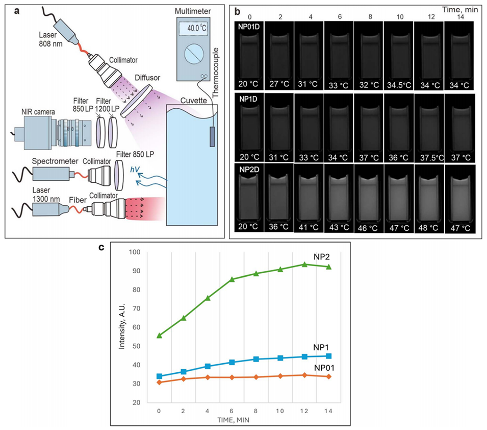 图3.(a):用于评估纳米制剂在1300 nm激光加热下近红外-短波红外(NIR-SWIR)荧光变化的实验装置示意图。(b):在1300 nm激光加热过程中,NP01D、NP1D、NP2D纳米制剂的NIR-SWIR荧光图像。(c):NIR-SWIR荧光强度随加热时间的变化。