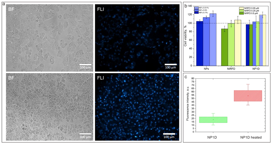 图4.(a):用NP1D处理的LLC细胞的透射(左列)和NIR-SWIR荧光(右列)显微镜图像,加热前(上)和加热后(下)。(b):LLC细胞在经过空白纳米颗粒、游离NIRFD和NP1D处理24小时后的细胞活性。(c):用NP1D处理的细胞在加热前后的荧光信号直方图。