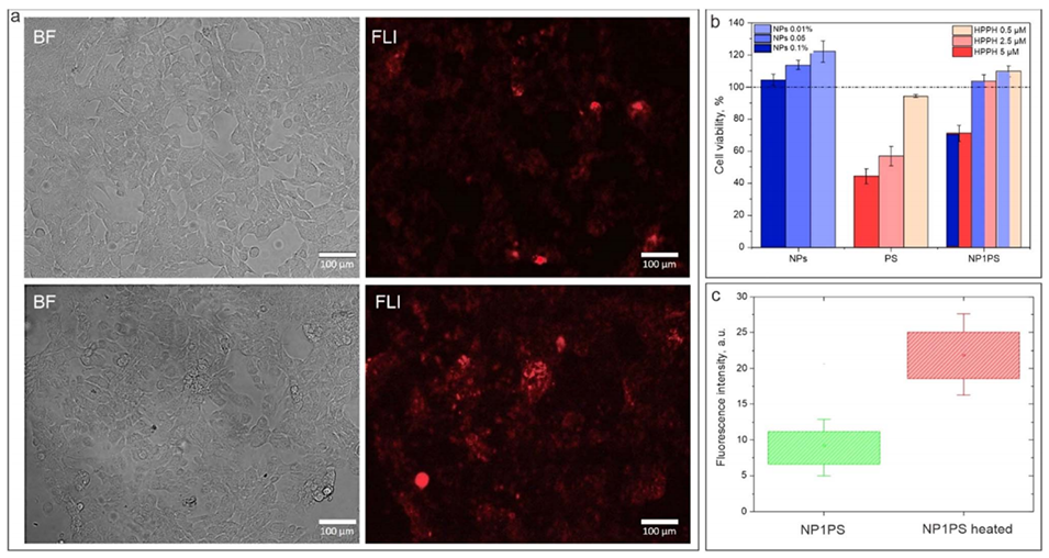 图6.(a):用NP1PS处理的活细胞的透射和荧光显微镜图像,加热前(上)和加热后(下)。(b):经过纳米颗粒、游离HPPH和NP1PS处理24小时后的培养细胞活性。(c):用NP1PS处理的细胞在加热前后的荧光强度直方图。