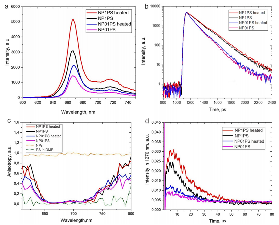 图5.(a):NP01PS和NP1PS纳米制剂在加热前后的荧光光谱。(b):未加热和加热的NP01PS和NP1PS纳米制剂的HPPH荧光衰减曲线。(c):NP01PS和NP1PS纳米制剂在加热前后的HPPH荧光各向异性光谱,游离PS在有机溶液中的荧光各向异性光谱,以及不含HPPH的纳米颗粒分散液的荧光各向异性光谱。(d):在加热和未加热条件下,由NP01PS和NP1PS敏化的单线态氧的磷光衰减曲线对比(在1270 nm处检测)。