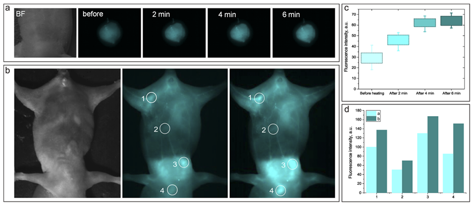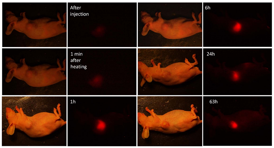 4、体外实验显示,加热至40°C后细胞荧光信号增强2–3倍;体内实验通过皮下、静脉或瘤内注射NF并结合1.3 μm激光局部加热,验证了热增强荧光成像效果。