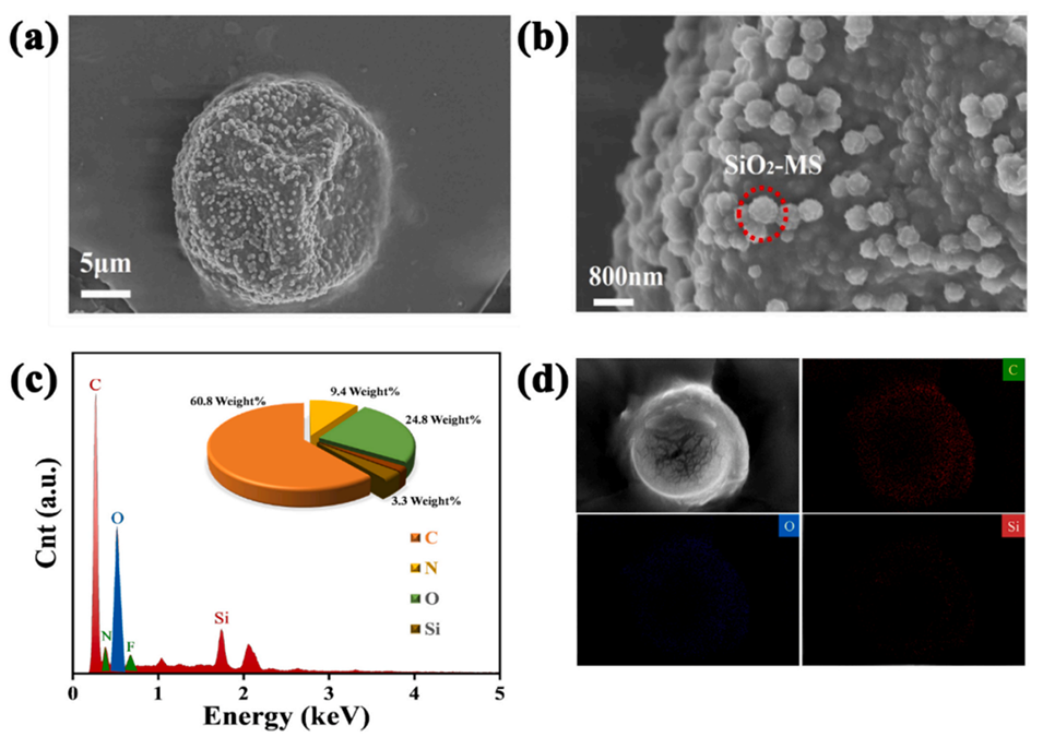 图2.(a)PEO@CS-SiO2微胶囊的SEM图像;(b)PEO@CS-SiO2微胶囊的放大SEM图像;(c,d)PEO@CSSiO2微胶囊的EDS能谱分析以及相应的映射图像。